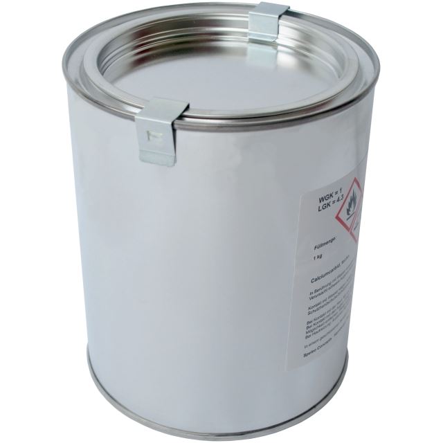 1 kg Karbid in 1 Liter Patentdeckeldose aus Weißblech verpackt.